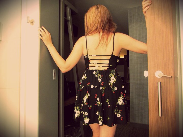 When it comes to going out in Southern California- I tend to dress a bit more on the provocative side- but without crossing the line into inappropriate territory. Mini skirts with a cute blouse and nice, dressy sandals? A sleeveless maxi dress with stiletto heels? Short shorts with a tattered band t-shirt and funky sneakers? I’ve worn ’em all at various points out West- so I opted for something a bit different this time around in this black and floral printed back-less, frilly mini-dress.
