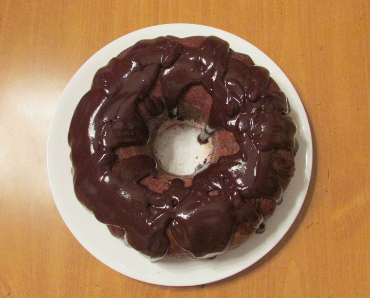 8. Pour the chocolate glaze over the cake, allowing it to drip down the sides and set for at least 15 minutes before serving.