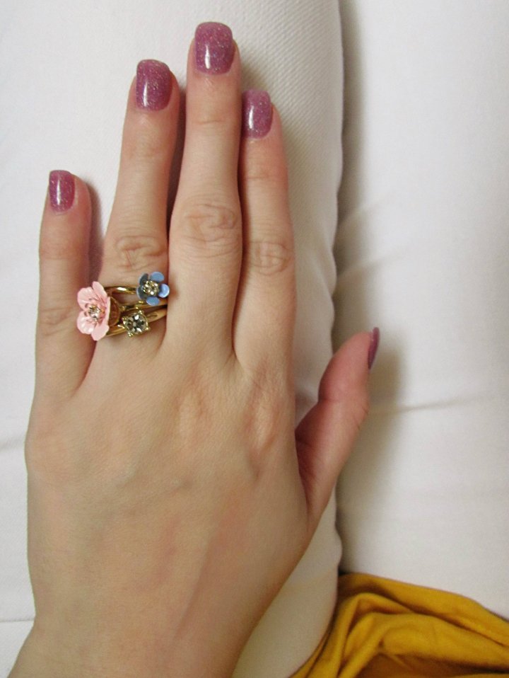 In regards to lilac accessories- I find that less is more. A pair of simple earrings. A bangle bracelet- or, as shown below- stacked rings that incorporate the color and some sparkle. I love these flower and “diamond” ones I picked up at Old Navy while I was grabbing some new gym attire a couple of weeks ago.