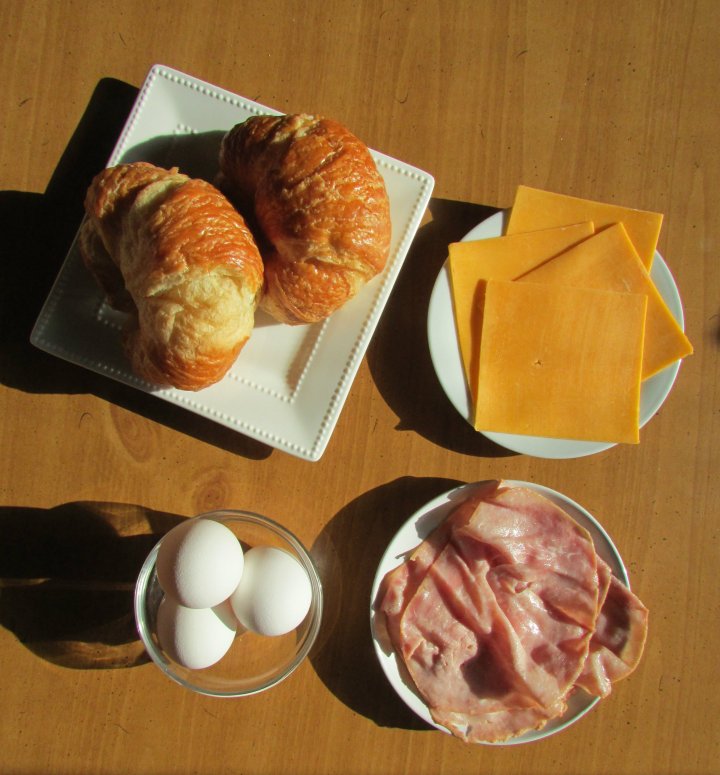 2. Fill croissants with eggs, ham and cheese to make 4 sandwiches. Wrap tightly in plastic wrap and place in the freezer.
