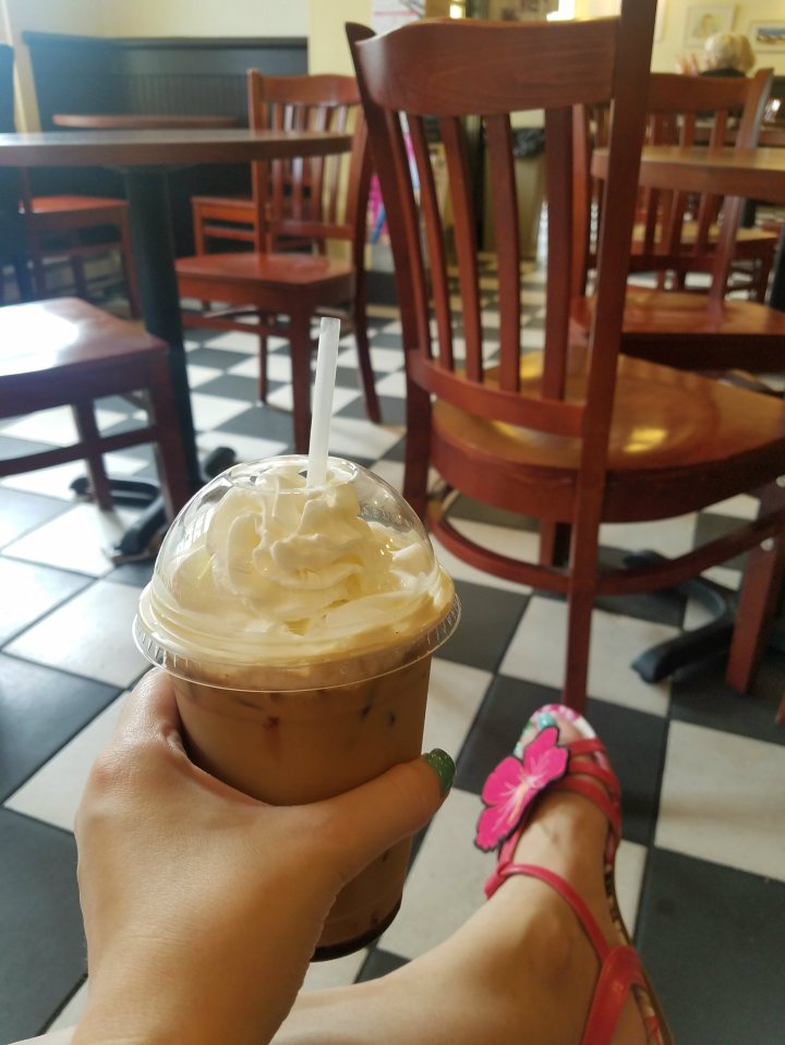 Since I was in “work mode” while out and about- I was sporting one of my favorite olive green, horizontal striped pencil skirts with a black, long-sleeved thermal top, black tights- and a black, bell-sleeved sweater/cape since it’s been ridiculously chilly as of late.