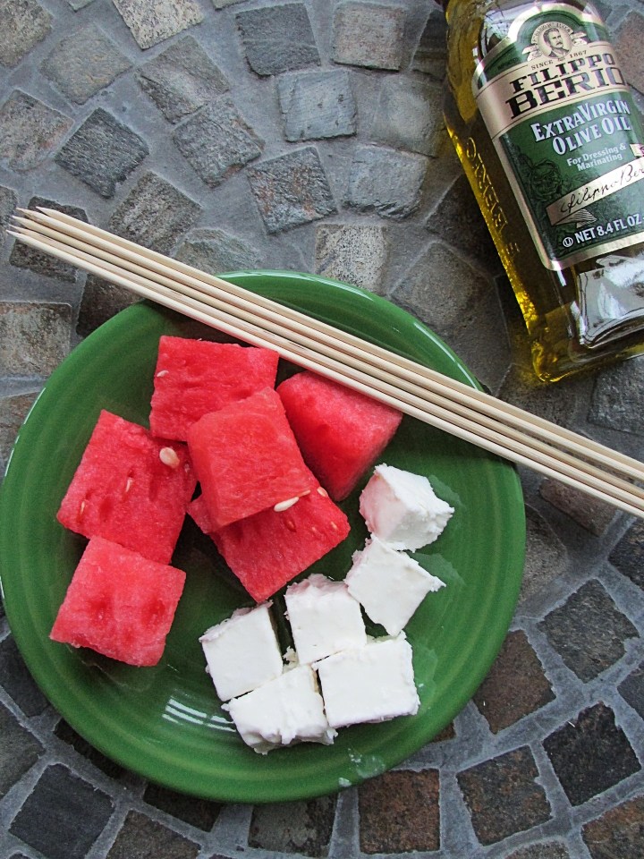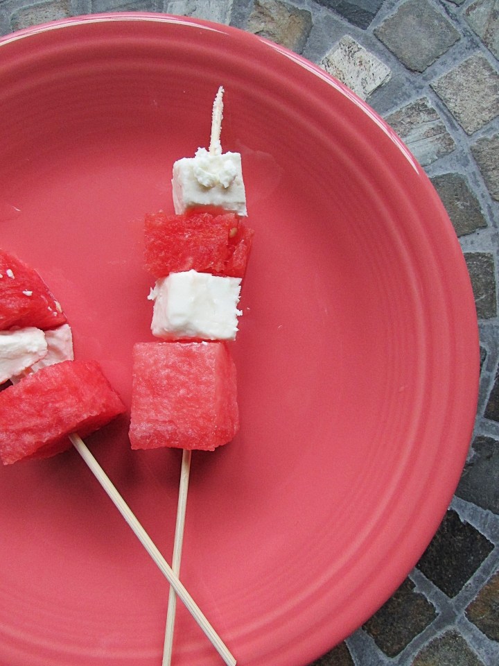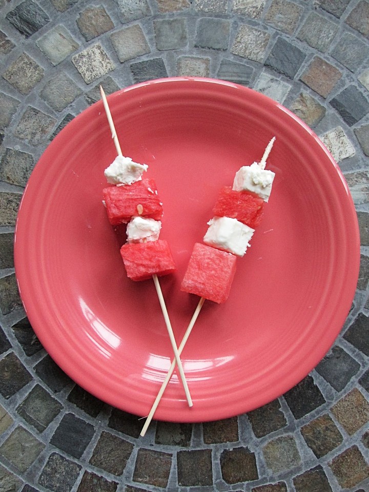- Set your grill to high heat. Thread a piece of watermelon, a piece of feta and a second piece of watermelon onto a 6-inch skewer. Repeat with the remaining pieces of watermelon and feta.