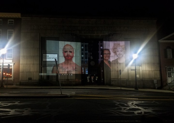 Last night, as a sign of resilience- multiple portraits of Joe in drag (all done by the same incredible photographer who had taken the ones that had been vandalized) were projected on the side of the former First National Bank where the originals had once hung. The impromptu art installation lasted all night- wrapping up this morning- and when I stopped by at nearly 1 a.m. the party was still going strong.