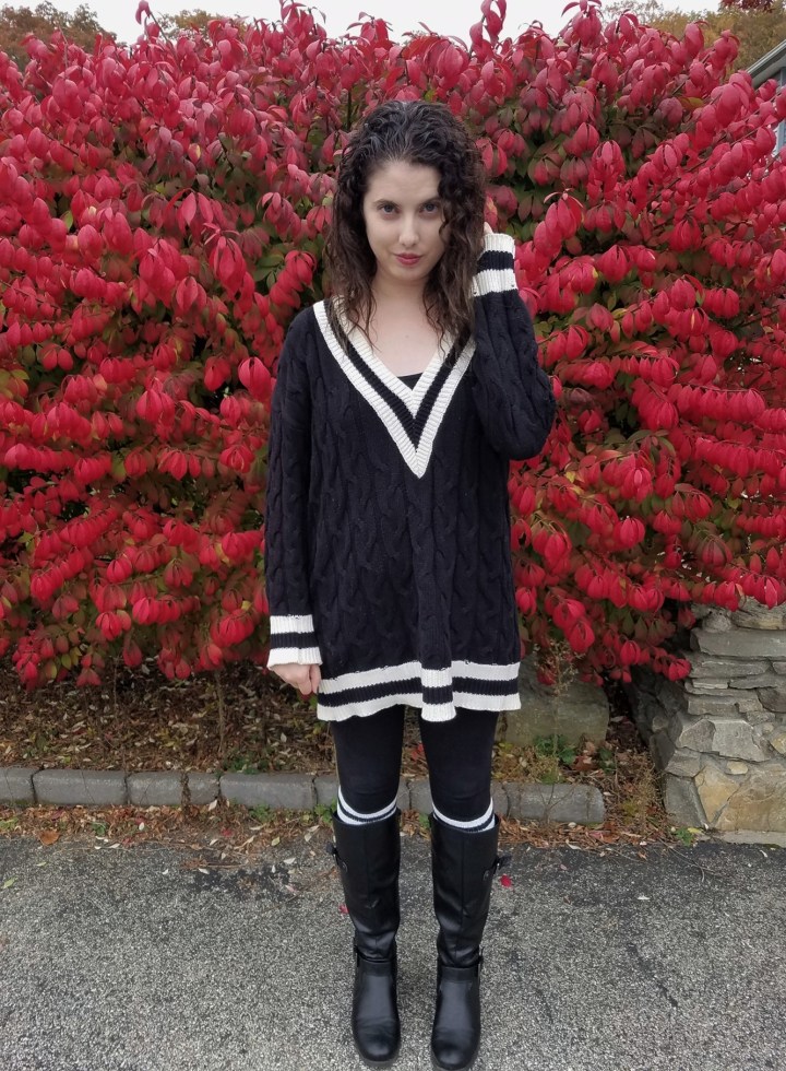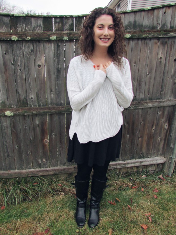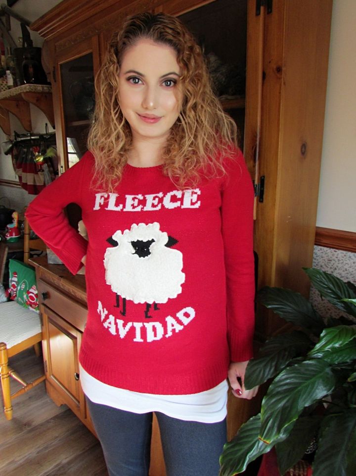 I’ve worn this a couple of times since receiving it- and it’s easy to dress up or down. My go-to is a pair of skinny jeans, my knee-high boots and a green velvet Santa hat (with tiny rhinestones sewn into the white cotton- which you may not be able to see in the photos!)